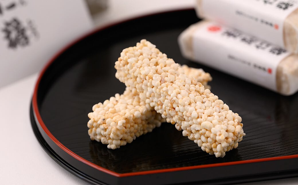 薏苡仁(ハトムギ)は、380年前の細川家の古文書に登場するなど、熊本に縁の深いもの。そのハトムギで作られたおこしが【薏苡仁糖】です。水飴で固めたおこしとは異なり、ほろほろとした軽い食感と優しい甘み、ほのかに香るはとむぎの香りが特徴。現在は茶席だけでなく、日常的なお茶菓子としても親しまれています。